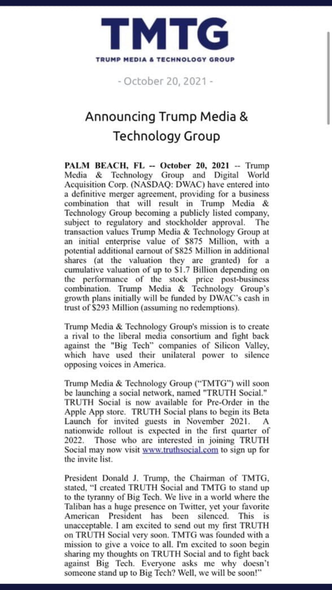 Der abgewählte Präsident sagte er habe das Geld für die Gründung seines eigenen börsennotierten Medienunternehmens zusammen. Truth Social heiße die neue Plattform kündigte Trump in einer Mitteilung eines dazu neu gegründeten Unternehmens an. President Trump wrote I created TRUTH Social and TMTG to stand up to the tyranny of Big Tech.